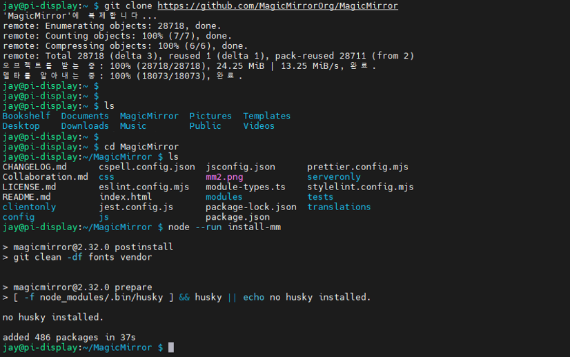 아래와 같이 진행되니 참고하자. 재부팅하면 백그라운드에서 Magic Mirror가 실행된다.