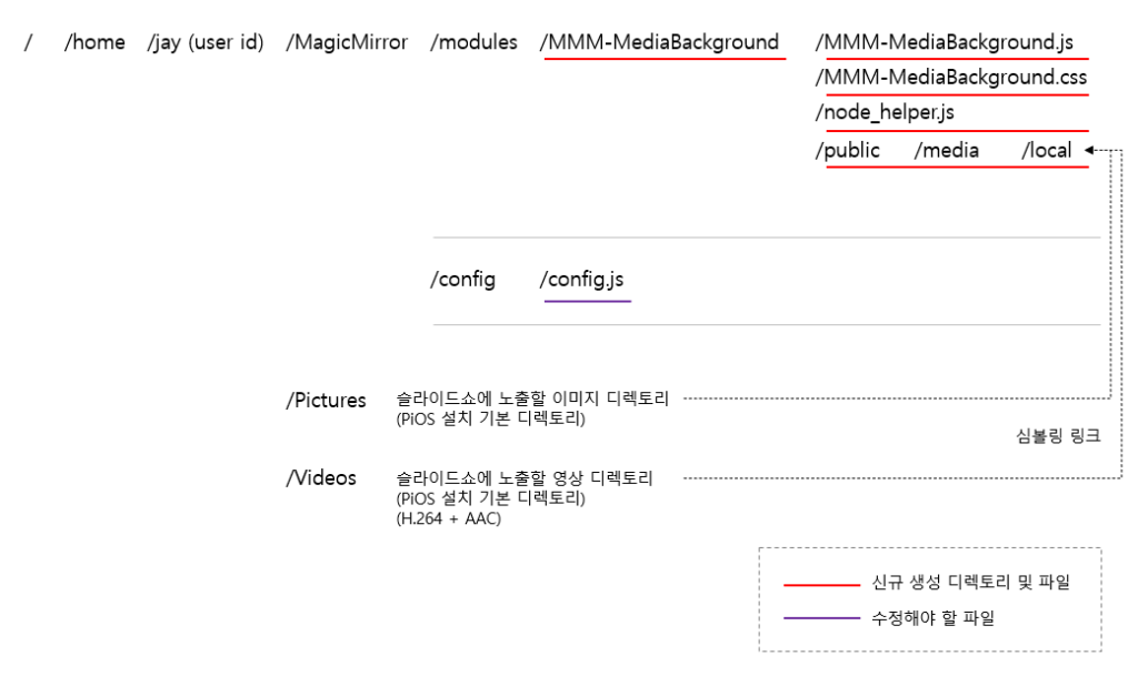기본적으로 Module은 Module 디렉토리에 안에서 운영되므로 Module 디렉토리 밖의 파일을 불러오기 위해서 아래와 같이 Pictures, Videos 디렉토리의 권한을 설정하고, 해당 파일들은 module 디렉토리에 MMM-MediaBackground에서 원활하게 읽을 수 있도록 심볼릭 링크로 이어주는 작업을 해야 한다. (물론 다른 방법도 있을텐데, Chat-GPT와 계속된 오류를 잡으면서 도달한 방법이 이러했다.)