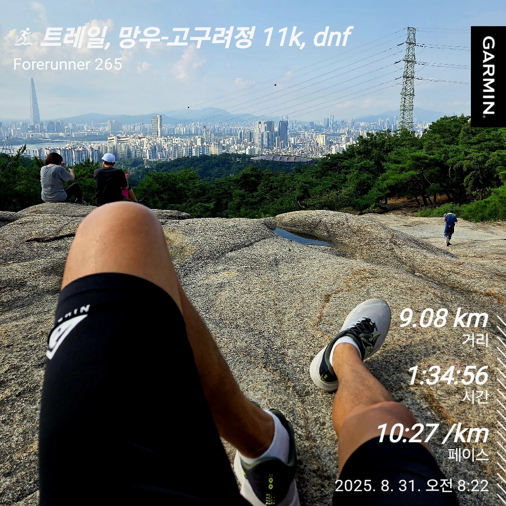 망우역사공원 -> 깔딱고개 -> 헬기장 -> 아차산 정상 -> 고구려정에서 반환하면 딱 11k 다. 주차 위치에 따라서는 12k가 될 수도 있는데, 오늘은 11k 지점이니 2k 남겨놓고 dnf 한 샘이다. 요며칠 계속 걷뛰로 피니쉬를 했는데, 오늘은 걷뛰도 포기한다.
